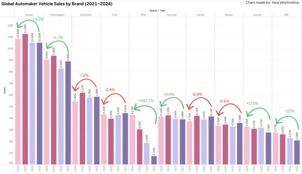 This prompted a deeper review of global vehicle sales for the top 10 automakers from 2021 through 2024. It is worth noting that consistent, comparable global sales data is difficult to source, so this analysis relies on official company press releases.