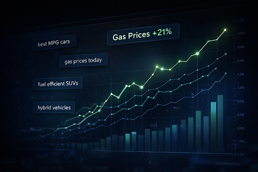 Queries now surging include “fuel efficient cars 2026,” “best MPG SUV,” “hybrid vs gas savings,” and “cars with lowest fuel cost per mile.” These are live opportunities with a short window before competition catches up and ranking difficulty increases.